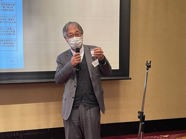 次に、新しく副会長に就任した保延理事から、就任挨拶と乾杯の発声で、懇親会が始まりました。最初、参加者は着席して静かに食事と会話を楽しんでいましたが、時間が進むにつれて、席を離れていろいろな方と名刺交換するなど、積極的に交流をしていました。ただし、各人マスク着用しながら、静かな声で会話をしていただくなど、コロナ感染症対策に協力していただきました。