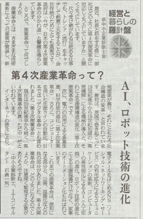 2019年4月9日 産経新聞朝刊奈良版のコラム「経営と暮らしの羅針盤」に石倉一利会員の「第4次産業革命って?」が掲載されました。